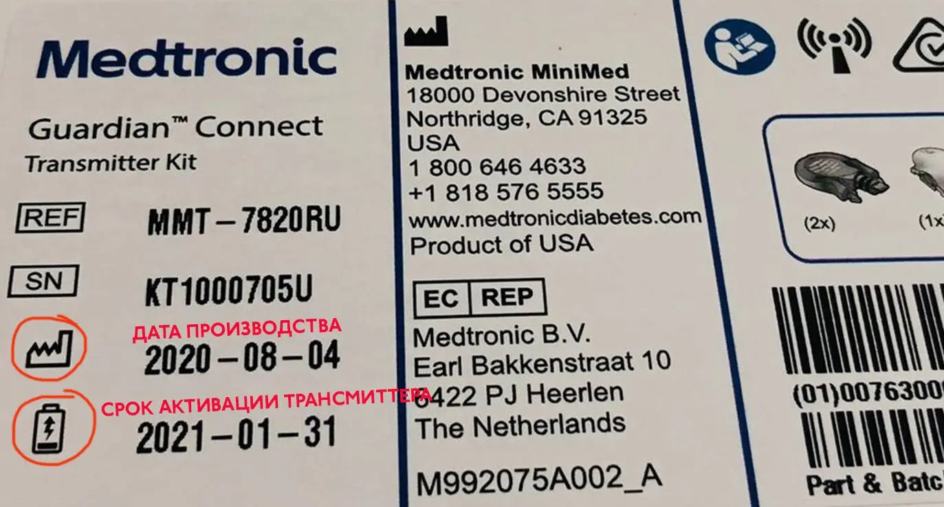 • вторая (помечена значком батарейки) - крайняя дата рекомендованного срока активации трансмиттера.