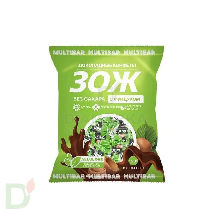 <h2>Шоколадные конфеты без сахара для правильного питания</h2> Мультибар - продукты для правильного и здорового питания из натуральных ингредиентов. БЕЗ сахара, красителей и ГМО. За сладость во вкусняшках Мультибар отвечает аллюлоза - природный полисахарид, который обладает сладким вкусом, при этом не усваивается ЖКТ, следовательно: его потребление не приводит к повышению уровня сахара крови.<br> <br> <h3>Преимущества подсластителя аллюлоза</h3> <ul> <li>низкое содержание углеводов и калорий</li> <li>без неприятного привкуса</li> <li>не влияет на ЖКТ, не вызывает слабительного эффекта</li> <li>не вредит зубам</li> </ul> Масса нетто 150 грамм<br> Срок годности - 9 месяцев<br> <h3>Состав конфет без сахара ЗОЖ Шоколад-Фундук</h3> Какао масло, молоко сухое цельное, подсластитель натуральный аллюлоза (аллюлоза, вода), какао тертое, обезвоженный молочный жир, фундук, эмульгатор (лецитин подсолнечный), ароматизатор натуральный. Молочный шоколад содержит общий сухой остаток какао не менее 33%, сухой обезжиренный остаток какао не менее 5%, сухой молочный остаток не менее 26%, молочный жир не менее 4%. <br> <h4>Калорийность конфет без сахара Мультибар</h4> б - 11,5г<br> ж - 39г<br> у - 15,2г<br> 458 ккал<br>