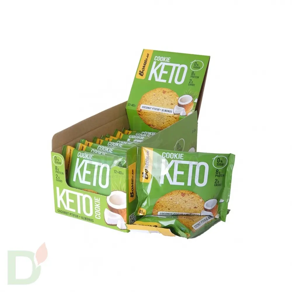 <h2>Кето-печенье Бомббар - полноценный сытный перекус</h2> Высокое содержание качественных жиров и белка делает это печенье суперпитательным и сытным перекусом. Когда захотелось перекусить находу, когда нет времени думать о том "чего бы такого съесть", да и просто если очень хочется сладенького - кето-печенье Bombbar придет на помощь! Обычное печенье даст вам сытость на 30, максимум 60 минут, так как содержит в основном простые углеводы. Наша новинка зарядит вас энергией и хорошим настроением на более длительное время!<br> <h2>Не только вкус, но и польза</h2> Помимо насыщенного вкуса и чувства сытости это печенье подарит вам невероятную пользу. Ведь оно:<br> <ul> <li>Сделано на основе миндаля, а значит содержит полезные ненасыщенные жиры, а также массу витаминов и микроэлементов</li> <li> Не содержит муки и сахара! Вместо сахара используются пребиотический подсластитель олигофруктоза и сукралоза</li> <li> Обогащено пищевыми волокнами, которые необходимы для правильной работы ЖКТ!</li> </ul> <h2>Состав кето-печенья Бомббар</h2> миндаль, концентрат сывороточного белка, масло кокосовое, водорастворимые волокна кукурузы, олигофруктоза(пищевые волокна из цикория), вода, эритрит, кокосовая стружка, продукты яичные (меланж яичный), соль, ароматизаторы натуральные, гидрокарбонат натрия(сода пищевая), регулятор кислотности - лимонная кислота, эмульгатор(соевый лецитин), антиокислитель (аскорбиновая кислота), подсластитель - сукралоза, консервант (сорбат калия).<br> <h2>КБЖУ на 1 порцию / 40 г / 1 печенье</h2> <ul> <li>Б - 8г</li> <li> Ж - 13г</li> <li> У - 2г</li> <li> Клетчатка - 7,6г</li> <li> Ккал - 172</li> </ul> Срок годности печенья - 9 месяцев<br> Масса нетто: 40 грамм